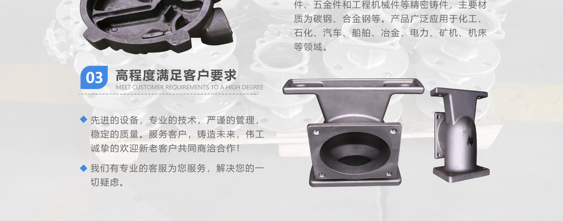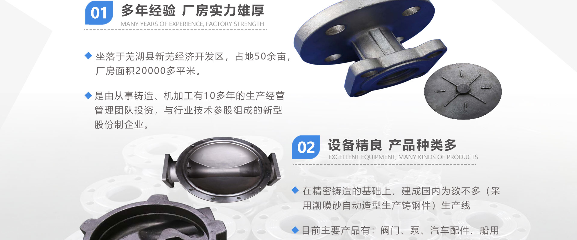 安徽偉工機械科技有限公司,坐落于安徽蕪湖新蕪經(jīng)濟開發(fā)區(qū),是一家専業(yè)從事鑄造產(chǎn)品設(shè)計、研發(fā)、生產(chǎn)、銷售于一體的企業(yè),公司為客戶的產(chǎn)品提供多樣的技術(shù)支持與設(shè)計,公司主要鑄造技術(shù)有潮模砂鑄造、硅溶膠精鑄工藝。主要產(chǎn)品有:不銹鋼閥門配件、泵閥配件、汽車配件、工業(yè)管道配件、工程機械配件、汽車配件等。材質(zhì)為:低合金鋼、304、316、316L、鉻鉬鋼、哈氏合金、碳鋼、雙相鋼等。公司已先后通過ISO9001和TS16949等多種體系審核,以完備的管理手段和齊全的檢測設(shè)備滿足客戶需求,進(jìn)的設(shè)備,専業(yè)的技術(shù),嚴(yán)謹(jǐn)?shù)墓芾?,穩(wěn)定的質(zhì)量。服務(wù)客戶,鑄造未來,偉工誠摯的歡迎新老客戶共同商洽合作